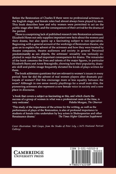 Before the Restoration of Charles II there were no professional actresses on the English stage, and female roles had almost always been played by men. This book describes how and why women were permitted to act on the public stage after 1660, and the consequences of their arrival for the drama of the period. There is a surprising lack of published research into Restoration actresses. Elizabeth Howe not only supplies important new facts about the women and their drama, but also opens up a fascinating subject to non-specialists. Beginning with a general account of the workings of Restoration theatre, she goes on to explain the advent of the actresses and how they were treated by theatre companies, theatre audiences and society in general. Perceived predominantly as sex objects, the actresses' sexuality was variously exploited in ways that had important consequences for drama. The remainder of the book concerns the lives and talents of the major figures, in particular Elizabeth Barry and Anne Bracegirdle, showing how their popularity, dramatic skill and public image frequently dictated the kinds of plays written for them. The book addresses questions that are relevant to women's issues in every period: how far did the advent of real women players alter dramatic portrayals of women? Did this encourage more or less equality between the sexes? Although in one sense merely playthings for a small male elite, the pioneering actresses also represent a new female voice in society and a new place in discourse.