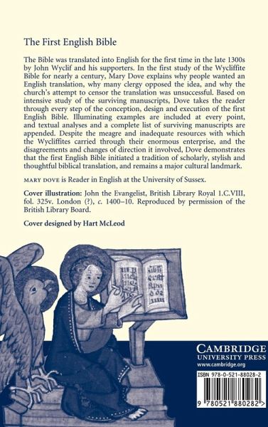 The Bible was translated into English for the first time in the late 1300s by John Wyclif and his supporters. In the first study of the Wycliffite Bible for nearly a century, Mary Dove explains why people wanted an English translation, why many clergy opposed the idea, and why the church's attempt to censor the translation was unsuccessful. Based on intensive study of the surviving manuscripts, Dove takes the reader through every step of the conception, design and execution of the first English Bible. Illuminating examples are included at every point, and textual analyses and a complete listing of surviving manuscripts are appended. Despite the meagre and inadequate resources with which the Wycliffites carried through their enormous enterprise, and the disagreements and changes of direction it involved, Dove demonstrates that the first English Bible initiated a tradition of scholarly, stylish and thoughtful biblical translation, and remains a major cultural landmark.