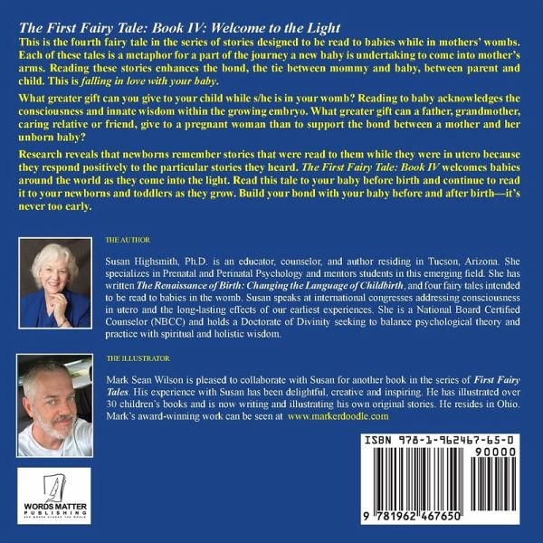 The First Fairy Tale: Book IV: Welcome to the Light This is the fourth fairy tale in the series of stories designed to be read to babies while in mothers' wombs. Each of these tales is a metaphor for a part of the journey a new baby is undertaking to come into mother's arms. Reading these stories enhances the bond, the tie between mommy and baby, between parent and child. This is falling in love with your baby. What greater gift can you give to your child while s/he is in your womb? Reading to baby acknowledges the consciousness and innate wisdom within the growing embryo. What greater gift can a father, grandmother, caring relative or friend, give to a pregnant woman than to support the bond between a mother and her unborn baby? Research reveals that newborns remember stories that were read to them while they were in utero because they respond positively to the particular stories they heard. The First Fairy Tale: Book IV welcomes babies around the world as they come into the light. Read this tale to your baby before birth and continue to read it to your newborns and toddlers as they grow. Build your bond with your baby before and after birth-it's never too early.