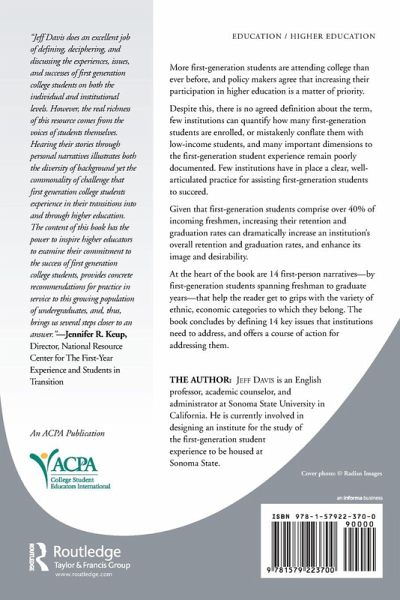 Jeff Davis is an English professor, academic counselor, and administrator at Sonoma State University in California. He became interested in the plight of first-generation college students when he was exposed to the work being done with nontraditional students on the Sonoma State campus through federal TRIO grant projects, which led to his becoming Director of a TRIO Student Support Service project and a TRIO McNair Scholars project. He is currently involved in designing an institute for the study of the first-generation student experience to be housed at Sonoma State.