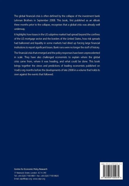 The global financial crisis is often defined by the collapse of the investment bank Lehman Brothers in September 2008. This book, first published as an eBook three months prior to the collapse, recognises that a global crisis was already well underway. It highlights how losses in the US subprime market had spread beyond the confines of the US mortgage sector and the borders of the United States, how risk spreads had ballooned and liquidity in some markets had dried up forcing large financial institutions to report significant losses. Bank runs were no longer the stuff of history. The financial crisis that emerged and the policy responses have been unprecedented in scale. They have also challenged economists to explain where the global crisis came from, where it was heading, and what could be done. This book brings together the views and predictions of leading economists published on VoxEU.org months before the developments of late 2008 in a volume that holds its own against the events that followed.
