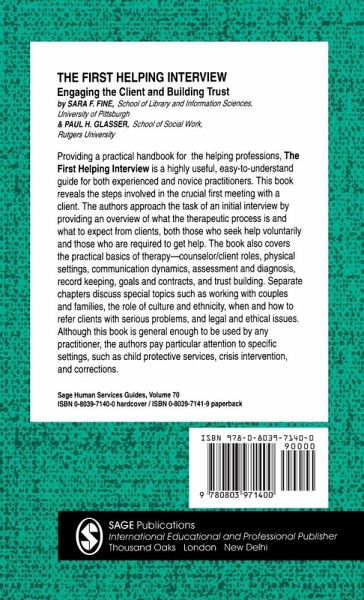 This highly practical guide for both experienced and novice professionals and students reveals the steps involved in the crucial first meeting with a client. The authors approach the task of an initial interview by providing an overview of the therapeutic process and what to expect from clients. The book also explores the practical basics of therapy - counsellor-client roles, physical settings, communication dynamics, assessment and diagnosis, record-keeping, goals and contracts and trust-building. Individual chapters discuss specialist topics such as working with couples and families, the role of culture and ethnicity, when and how to refer clients with serious problems, and legal and ethical issues.
