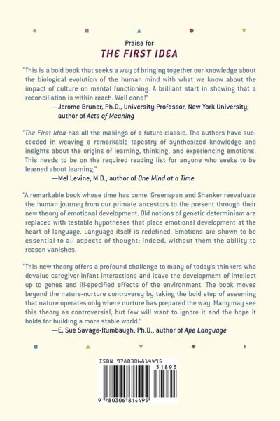 In the childhood of every human being and at the dawn of human history there is an amazing and, until now, unexplained leap from simple genetically programmed behaviour to language, symbolic thinking, and culture. In The First Idea , Stanley Greenspan and Stuart Shanker explore this missing link and offer brilliant new insights into two longstanding questions: how human beings first create symbols and how these abilities evolved and were transmitted across generations over millions of years. From fascinating research into the intelligence of both human infants and apes, they identify certain cultural practices that are vitally important if we are to have stable and reflective future societies.