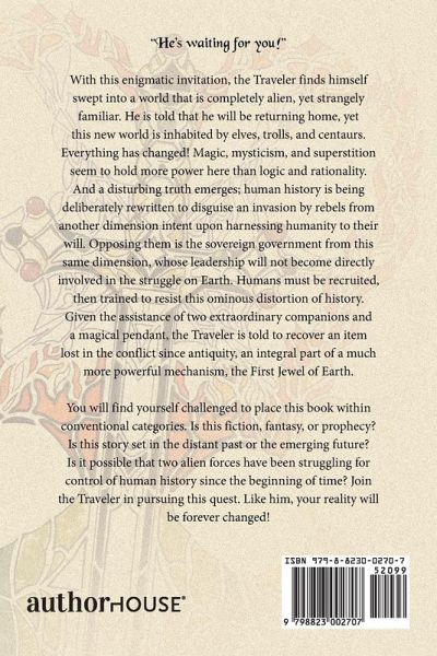 "He's waiting for you!" With this enigmatic invitation, the Traveler finds himself swept into a world that is completely alien, yet strangely familiar. He is told that he will be returning home, yet this new world is inhabited by elves, trolls, and centaurs. Everything has changed! Magic, mysticism, and superstition seem to hold more power here than logic and rationality. And a disturbing truth emerges; human history is being deliberately rewritten to disguise an invasion by rebels from another dimension intent upon harnessing humanity to their will. Opposing them is the sovereign government from this same dimension, whose leadership will not become directly involved in the struggle on Earth. Humans must be recruited, then trained to resist this ominous distortion of history. Given the assistance of two extraordinary companions and a magical pendant, the Traveler is told to recover an item lost in the conflict since antiquity, an integral part of a much more powerful mechanism, the First Jewel of Earth. You will find yourself challenged to place this book within conventional categories. Is this fiction, fantasy, or prophecy? Is this story set in the distant past or the emerging future? Is it possible that two alien forces have been struggling for control of human history since the beginning of time? Join the Traveler in pursuing this quest. Like him, your reality will be forever changed!