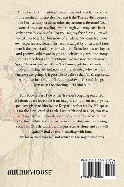 At the turn of the century, a promising and largely unknown future awaited this traveler. But was it the Twenty-first century, the First century, or some other mysterious milestone? You were there, also traveling, even though you may have been only partially aware of it. For you see, my friend, we all travel, sometimes together, but more often alone. We learn from our own experiences, sometimes lessons taught by others, and then there is the perpetual quest for wisdom. Some lessons are joyous and positive, others are tragic and debilitating, while so many others are tedious and repetitious. We treasure the seemingly 'good' lessons and regret the 'bad' ones, yet they all contribute to our promising and unknown future, shaping who we are and where we are going. Is it possible to believe that "all things could work together for good"? All things? Even the bad things? Join us in the traveling. Let's find out! This book is Part Two of the Traveler's ongoing search for Wisdom, a rare jewel that is an integral component to a mystical pendant given to him by the King of another reality. His quest is for the First Jewel of Earth. First published in 1999, this new edition has been revised, re-edited, and refreshed with new chapters. While it would be a more complete journey having read Part One first, this second part stands alone and you will quickly find yourself traveling with him. But be warned, you will not return to the way it once was!