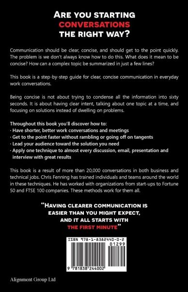 Get people's attention and get to the point. Learn the simplest way to improve your business communication skills. There is no fluff and no vague advice, just practical step-by-step methods you can start using today. This multi-award-winning book teaches specific methods for professional business conversations, emails, meetings, interviews, and more. Check out the reviews to hear from the real people this book has helped. Communication should be clear and concise, and we should get to the point quickly. The problem is we don't always know how to do this. What does it mean to be concise? How can a complex topic be summarized in just a few lines? This award-winning book is a step-by-step guide for clear, concise communication in everyday work conversations. Being concise is not about trying to condense all the information into sixty seconds. It is about having clear intent, talking about one topic at a time, and focusing on solutions instead of dwelling on problems. Throughout this book you'll discover how to: · Have shorter, better work conversations and meetings · Get to the point faster without rambling or going off on tangents · Lead your audience toward the solution you need · Apply one technique to almost every discussion, email, presentation and interview with great results This book is a result of more than 20,000 conversations in both business and technical jobs. Chris Fenning has trained individuals and teams around the world in these techniques. He has worked with organizations from start-ups to Fortune 50 and FTSE 100 companies. These methods work for them all. Having clearer communication is easier than you might expect, and it all starts with the first minute.