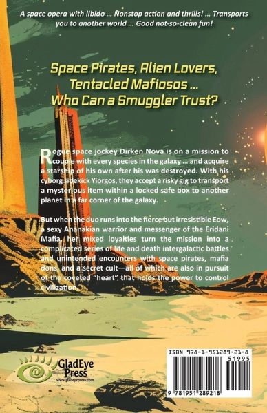 Rogue space jockey Dirken Nova is on a mission to couple with every species in the galaxy ... and acquire a starship of his own after his was destroyed. With his cyborg sidekick Yiorgos, they accept a risky gig to transport a mysterious item within a locked safe box to another planet in a far corner of the galaxy. But when the duo runs into the fierce but irresistible Eow, a sexy Ananakian warrior and messenger of the Eridani Mafia, her mixed loyalties turn the mission into a complicated series of life and death intergalactic battles and unintended encounters with space pirates, mafia dons, and a secret cult-all which are in pursuit of the coveted "heart" that holds the power to control civilization.