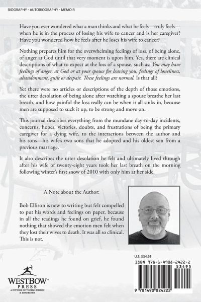 Have you ever wondered what a man thinks and what he feels-truly feels-when he is in the process of losing his wife to cancer and is her caregiver? Have you wondered how he feels after he loses his wife to cancer? Nothing prepares him for the overwhelming feelings of loss, of being alone, of anger at God until that very moment is upon him. Yes, there are clinical descriptions of what to expect at the loss of a spouse, such as: You may have feelings of anger, at God or at your spouse for leaving you, feelings of loneliness, abandonment, guilt or despair. These feelings are normal. Is that all? Yet there were no articles or descriptions of the depth of those emotions, the utter desolation of being alone after watching a spouse breathe her last breath, and how painful the loss really can be when it all sinks in, because men are supposed to suck it up, to be strong and move on. This journal describes everything from the mundane day-to-day incidents, concerns, hopes, victories, doubts, and frustrations of being the primary caregiver for a dying wife, to the interactions between the author and his sons-his wife's two sons that he adopted and his oldest son from a previous marriage. It also describes the utter desolation he felt and ultimately lived through after his wife of twenty-eight years took her last breath on the morning following winter's first snow of 2010 with only him at her side.