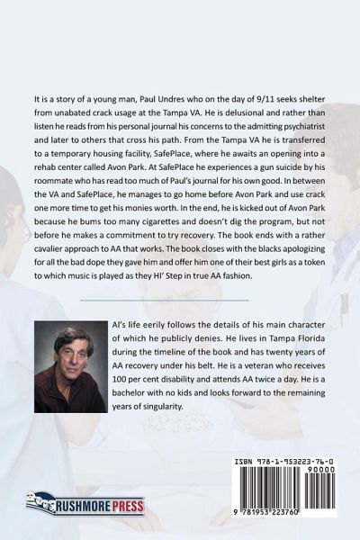 It is a story of a young man, Paul Undres who on the day of 9/11 seeks shelter from unabated crack usage at the Tampa VA. He is delusional and rather than listen he reads from his personal journal his concerns to the admitting psychiatrist and later to others that cross his path. From the Tampa VA he is transferred to a temporary housing facility, SafePlace, where he awaits an opening into a rehab center called Avon Park. At SafePlace he experiences a gun suicide by his roommate who has read too much of Paul's journal for his own good. In between the VA and SafePlace, he manages to go home before Avon Park and use crack one more time to get his monies worth. In the end, he is kicked out of Avon Park because he bums too many cigarettes and doesn't dig the program, but not before he makes a commitment to try recovery. The book ends with a rather cavalier approach to AA that works. The book closes with the blacks apologizing for all the bad dope they gave him and offer him one of their best girls as a token to which music is played as they HI' Step in true AA fashion.