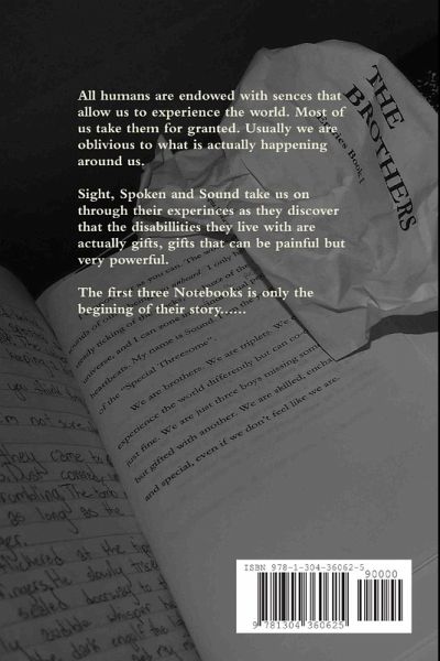The perception of our society is that people who are different in any way are strange, weak, or disabled. Sometimes even the senses can lie to you. Three brothers all different but special, take us on a dark and magical journey as they discover that outward senses sometimes mask great power and deep secrets that each can feel in their own personal way but that no one can imagine, unless of course they read the journals that have been the center of their lives for such a long time. This is the way into their world.