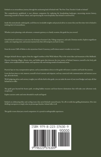 Embark on an extraordinary journey through the enchanting land of Ireland with "The First Time Traveler's Guide to Ireland." This comprehensive guidebook is your ultimate companion for exploring the breathtaking landscapes, uncovering ancient history, immersing yourself in vibrant culture, and experiencing the warm hospitality that Ireland is renowned for. Inside this meticulously crafted guide, you'll discover invaluable insights and practical advice to ensure that your first-time visit to Ireland is nothing short of extraordinary. Whether you're planning a solo adventure, a romantic getaway, or a family vacation, this guide has you covered. Unveil Ireland's rich history as you trace the footsteps of ancient Celts, Viking conquerors, and early Christian monks. Explore magnificent castles, awe-inspiring ruins, and ancient mystical sites that will transport you back in time. From the iconic Cliffs of Moher to the mysterious Giant's Causeway, you'll witness nature's wonders at every turn. Navigate Ireland's diverse regions, from the rugged coastlines of the Wild Atlantic Way to the serene lakes and mountains of the Midlands. Discover charming villages, vibrant cities, and hidden gems that showcase the true essence of Ireland. Immerse yourself in the lively pub culture, savor traditional Irish cuisine, and experience the soul-stirring sounds of traditional music. Practical tips on visas, transportation options, and accommodation choices in this guide will ensure a seamless and hassle-free journey. Learn the best times to visit, immerse yourself in local customs and etiquette, and stay connected with communication and internet access tips, all in this book. With budgeting advice and currency insights you will also find in this guide, you can make the most of your travel budget and enjoy all that Ireland has to offer. This guide goes beyond the beaten path, revealing hidden treasures and lesser-known destinations that will make your adventure truly exceptional. Explore ancient castles and ruins shrouded in myth and legend. Embark on exhilarating hikes and cycling routes that unveil Ireland's natural beauty. Tee off at world-class golfing destinations. Dive into thrilling watersports or simply relax on picturesque beaches. Ireland offers it all. This guide is more than just a travel companion; it's a portal to unforgettable experiences. Whether you dream of wandering the vibrant streets of Dublin, immersing yourself in the serenity of the countryside, or tracing your ancestral roots, this guidebook will empower you to create lifelong memories and discover the magic of Ireland.