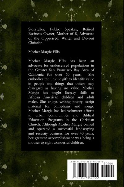 Storyteller, Public Speaker, Retired Business Owner, Mother of 8, Advocate of the Oppressed, Writer and Devout Christian Mother Margie Ellis Mother Margie Ellis has been an advocate for underserved populations in the Greater San Francisco Bay Area of California for over 60 years. She embodies the unique gift to identify value in people and things that others may disregard as having no value. Mother Margie has taught literacy skills to African American children and adult males. She enjoys writing poetry, script material for comedians and songs. Mother Margie has led volunteer efforts in urban communities and Biblical Education Programs in the Christian Church. Although Mother Margie owned and operated a successful landscaping and security business for over 40 years, her greatest accomplishment was being a mother to eight wonderful children.