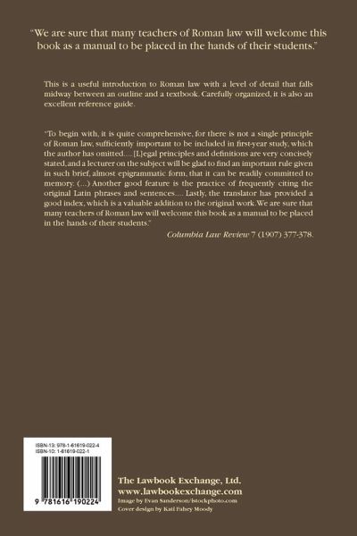 A comprehensive Roman law manual that covers history, persons (including family law and slavery), things, actions, ownership and successions This is a useful introduction to Roman law with a level of detail that falls midway between an outline and a textbook. Carefully organized, it is also an excellent reference guide. To begin with, it is quite comprehensive, for there is not a single principle of Roman law, sufficiently important to be included in first-year study, which the author has omitted.... [L]egal principles and definitions are very concisely stated, and a lecturer on the subject will be glad to find an important rule given in such brief, almost epigrammatic form, that it can be readily committed to memory. (...) Another good feature is the practice of frequently citing the original Latin phrases and sentences.... Lastly, the translator has provided a good index, which is a valuable addition to the original work. We are sure that many teachers of Roman law will welcome this book as a manual to be placed in the hands of their students. Columbia Law Review 7 (1907) 377-378 Table of Contents Author's preface Translator's introductory note Book I History of the Roman law Book II Persons Book III Things Book IV Acctions Book V Ownership Book VI Successions Book VII Donationes inter vivos and mortis causa Index