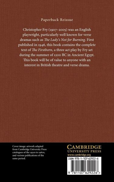 Christopher Fry (1907-2005) was an English playwright, particularly well known for verse dramas such as The Lady's Not for Burning. First published in 1946, this book contains the complete text of The Firstborn, a three act play by Fry set during the summer of 1200 BC in Ancient Egypt. This book will be of value to anyone with an interest in British theatre and verse drama.