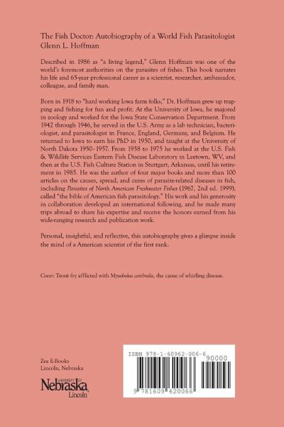 Glenn Hoffman was one of the world's foremost authorities on the parasites of fishes. This book narrates his life and 65-year professional career as a scientist, researcher, ambassador, colleague, and family man, and gives a glimpse inside the mind of a American scientist of the first rank. Born in 1918 to "hard working Iowa farm folks," Dr. Hoffman studied zoology at the University of Iowa, served in the U.S. Army 1942-46 as a lab technician, bacteriologist, and parasitologist in France, England, Germany, and Belgium, earned his PhD in 1950, and taught at the University of North Dakota 1950-1957. From 1958 until his retirement in 1985 he worked for the U.S. Fish & Wildlife Services in Leetown, WV, and in Stuttgart, Arkansas,. He wrote four major books and more than 100 articles on the causes, spread, and cures of parasite-related diseases in fish, including Parasites of North American Freshwater Fishes (1967, 2nd ed. 1999), called "the bible of American fish parasitology."