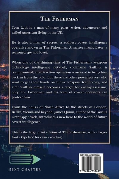 Tom Lyth is a man of many parts; writer, adventurer and exiled American living in the UK. He is also a man of secrets: a ruthless covert intelligence operative known as The Fisherman. A master manipulator, a seasoned spy and lover. When one of the shining stars of The Fisherman's weapons technology intelligence network, codename Sailfish, is compromised, an extraction operation is ordered to bring him back in from the cold. But there are other power players who want to get their hands on future weapons technology, and after Sailfish himself becomes a target for enemy assassins, only The Fisherman and his team of covert operators can protect him. From the Souks of North Africa to the streets of London, Berlin, Vienna and beyond, James Quinn, author of the Gorilla Grant spy novels, introduces a new hero to the world of future covert intelligence. This is the large print edition of The Fisherman, with a larger font / typeface for easier reading.