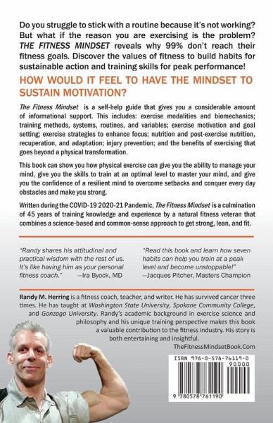 Many people place value on fitness but either don't do it or give up too quick. The reason is that they have unrealistic expectations and do not know their body type to match their training plan to reach a goal and the know-how to do it. The Fitness Mindset speaks of the what and the why and shows you the how. Apply each habit in each chapter of this book, focus on the "process" (rather than the goal itself), and reap the results! Review "A comprehensible and motivating self-help book to get into shape with some excellent information about macronutrient ratios, injuries, and biomechanics of safe and effective lifting. Knowledge to get the beginner started and a lot to offer to the experienced lifter who needs to grow and add diversity to his or her workout routine." - Llewellyn Williams, MD "An easy to follow and insightful read. Getting your head into the game of physical fitness is often times the hardest part. A lot of great ways to get motivated and stay motivated." - Matt Atwood, Competitive Bodybuilder "The Fitness Mindset is like having Randy as your personal fitness coach with the practical wisdom he shares." - Ira Byock, MD "Read this book and learn how seven habits can help you train at a peak level and become unstoppable." - Jacques Pitcher, 3x North American Masters Champion and NPC Judge ¿¿¿¿¿¿¿ Overview If you want to build muscle and lose fat, then the objective is to train for muscular endurance 60 minutes every day, and rest days become optional. The Fitness Mindset shows you how to apply this to a domestic 9-5 lifestyle: work, train, home, sleep, repeat. Many people do not get results as quick as they want because they are not focused on "exercising" to perform at an optimal level, but are rather distracted by things going around them. Either exercise intensity decreases or exercising becomes harder to complete. A 60-minute weight training and 60-minute cardio session each can incinerate up to 1,000 calories an hour when performed at a steady-state of 80% HIT! Building muscle and losing fat simultaneously in the quickest amount of time is what "exercising" is all about. This is the core of The Fitness Mindset: 7 Habits For Peak Performance. Feel and look better within days and increase your physical fitness four-fold in 12 to 16 weeks! Intensity is measured by how much muscle tension you can create in the shortest amount of time to fatigue the muscles so that they can adapt and get stronger and bigger! Getting results by altering physical appearance and improving functional ability is not 80% nutrition and 20% exercise, but quite the opposite: 80% exercise and 20% nutrition. We spend less time meal prepping during the week than exercising. "Exercising" takes more time (and effort), even in preparation. Recent studies show that exercising influences healthier eating...for increasing performance and getting better results! General training variables (sets, reps, rest days) and training systems (high-volume vs high-intensity) set forth in The Fitness Mindset can help you determine what type of training routine (full-body vs split), method of training (ascending pyramid, 5x5, reverse pyramid), and training techniques (supersets, burnsets, dropsets, rest/pause, etc.) is best for your body and goal to get the results you want! Over 50 images, charts, and diagrams with over 100 endnotes for further reference!