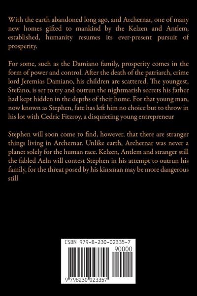 With the earth abandoned long ago, and Archernar, one of many new homes gifted to mankind by the Kelzen and Antlem, established, humanity resumes its ever-present pursuit of prosperity. For some, such as the Damiano family, prosperity comes in the form of power and control. After the death of the patriarch, crime lord Jeremias Damiano, his children are scattered. The youngest, Stefano, is set to try and outrun the nightmarish secrets his father had kept hidden in the depths of their home. For that young man, now known as Stephen, fate has left him no choice but to throw in his lot with Cedric Fitzroy, a disquieting young entrepreneur Stephen will soon come to find, however, that there are stranger things living in Archernar. Unlike earth, Archernar was never a planet solely for the human race. Kelzen, Antlem and stranger still the fabled Aeln will contest Stephen in his attempt to outrun his family, for the threat posed by his kinsman may be more dangerous still