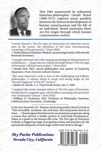 Back in print after 60 years! The Five Ages of Humanity (a revised and retitled edition of The Five Ages of Man) is the 1964 masterwork by influential author, historian, and philosopher Gerald Heard (1889-1971). Heard explores many parallels between the historical development of human consciousness and the life of an individual. He maintains there are five stages through which human consciousness evolves. With a new foreword by noted educator Thomas Armstrong, PhD, and two notable new endorsements, The Five Ages of Humanity promises to reach a new generation of readers with its endless wealth of ideas. In his foreword, Dr. Armstrong praises Heard's book as "This incredible synthesis, this rich feast, this sumptuous festival of ideas. ... Heard argues that historical consciousness progresses along a course that mirrors a similar pattern in individual development. Taken as a guide to the human life cycle, The Five Ages of Humanity includes a staggering range of progressive ideas and practices for the optimal development of each stage of life from birth to old age." In Heard's words, "By extending and applying the already accepted principles of phylogeny and ontogeny [to] the social and personal history of man, a real psychological interpretation of history can be made. History can now be seen as the reflection cast by the evolving consciousness of [humanity]." Heard contends that humankind's consciousness has evolved in five distinct stages, each of which recapitulates a historical epoch. Each of these stages has a dysfunctional characteristic that handicaps the individual and the human species. Heard proposes ways by which each dysfunctional characteristic might be remedied through various practices. This newly updated, authorized edition of The Five Ages of Humanity includes new tables; an expanded glossary; a new editor's preface and afterword; corrections to various spelling, formatting, and factual errors; and additional minor edits.