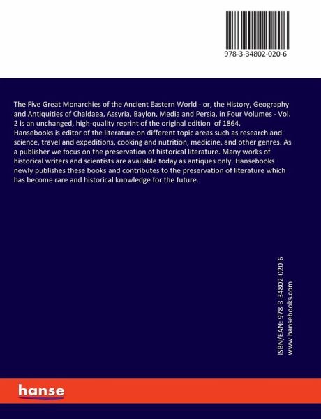 The Five Great Monarchies of the Ancient Eastern World - or, the History, Geography and Antiquities of Chaldaea, Assyria, Baylon, Media and Persia, in Four Volumes - Vol. 2 is an unchanged, high-quality reprint of the original edition of 1864.Hansebooks is editor of the literature on different topic areas such as research and science, travel and expeditions, cooking and nutrition, medicine, and other genres. As a publisher we focus on the preservation of historical literature. Many works of historical writers and scientists are available today as antiques only. Hansebooks newly publishes these books and contributes to the preservation of literature which has become rare and historical knowledge for the future.
