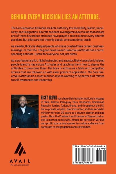 Behind every decision lies an attitude. The Five Hazardous Attitudes are Anti-authority, Invulnerability, Macho, Impulsivity, and Resignation. Aircraft accident investigators have found that at least one of these hazardous attitudes have played a role in almost every aircraft accident. But pilots are not the only people who sometimes crash. As a leader, Ricky has helped people who have crashed their career, business, marriage, or their life. The good news is each Hazardous Attitude has a corresponding antidote. Useful for everyone, not just pilots. As a professional pilot, flight instructor, and pastor, Ricky's passion is helping people identify Hazardous Attitudes and teaching them how to deploy the antidotes to overcome them. The book is written as a fable with compelling stories that are followed up with clear points of application. The Five Hazardous Attitudes is a must-read for anyone wanting to be better as it relates to self-awareness and leadership.