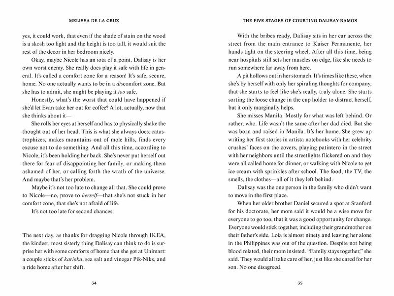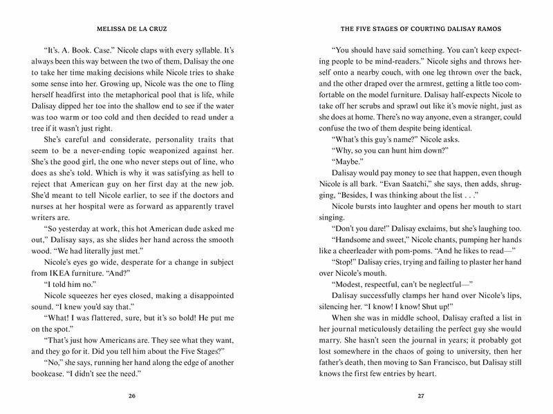 A sweet and spicy multicultural romantic comedy that that blends the rich tapestry of Filipino courtship rituals with the modern complexities of love, family, and cultural expectations, written by #1 New York Times bestselling author Melissa de la Cruz. Evan Saatchi can’t keep his eyes off his new co-worker, Dalisay Ramos. Newly arrived from Manila to lead their travel app’s Asia division, nothing matters more to Dalisay than tradition and family. When Evan asks her out, she soundly rejects him for his cheek. Evan learns from his Filipino friends that Dalisay expects more from potential suitors. If he wants a chance with her, he’s going to have to go through the Five Stages: the courtship ritual that lovers in the Philippines have performed for generations. At first, Evan is skeptical—what, exactly, does “servitude” entail? And he has to sing?! But when Dalisay bets Evan that he doesn’t have the nerve to make it through the stages, the game is on. As Evan attempts to prove to Dalisay that he can win her heart—and the bet—Dalisay is driven to distraction by Evan’s sexy labors, and soon their “courtship” turns into a sizzling secret. But when modern love and family expectations collide, Dalisay and Evan must find a way to carry a rich history into a shared future. Featuring a memorable cast of characters navigating the intersection of cultural traditions, workplace dynamics, and the magic of true love, this heart-warming Asian American romance is perfect for fans of Kevin Kwan books, Red String Theory, and other voicey Asian American authors. Melissa de la Cruz thoughtfully explores the push and pull of contemporary desires and deep-rooted familial expectations, all set against the backdrop of a will-they-won’t-they workplace romance that will leave readers swooning.
