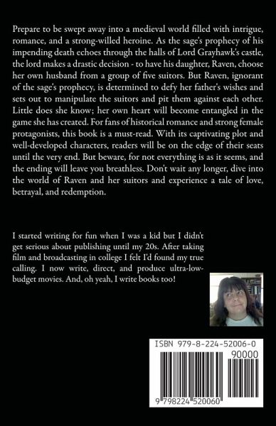 Prepare to be swept away into a medieval world filled with intrigue, romance, and a strong-willed heroine. As the sage's prophecy of his impending death echoes through the halls of Lord Grayhawk's castle, the lord makes a drastic decision - to have his daughter, Raven, choose her own husband from a group of five suitors. But Raven, ignorant of the sage's prophecy, is determined to defy her father's wishes and sets out to manipulate the suitors and pit them against each other. Little does she know; her own heart will become entangled in the game she has created. For fans of historical romance and strong female protagonists, this book is a must-read. With its captivating plot and well-developed characters, readers will be on the edge of their seats until the very end. But beware, for not everything is as it seems, and the ending will leave you breathless. Don't wait any longer, dive into the world of Raven and her suitors and experience a tale of love, betrayal, and redemption.