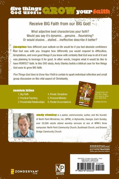 Imagine what life would be like if you had PERFECT faith. In this video-based Bible study (DVD sold separately), pastor and best-selling author Andy Stanley builds a biblical case for five things God uses to grow BIG faith. Imagine how different your outlook on life would be if you had absolute confidence that God was with you. Imagine how differently you would respond to difficulties, temptations, and even good things if you believed with certainty that God was in all of it and was planning to leverage every circumstance for good. This Participant Guide is filled with helpful discussion starters, video overviews, a Leader's Guide and much more. It's designed to be used with the companion Five Things God Uses to Grow Your Faith DVD (sold separately). When used together they provide a powerful catalyst for spiritual growth. Sessions include: 1. Big Faith 2. Practical Teaching 3. Providential Relationships 4. Private Disciplines 5. Personal Ministry 6. Pivotal Circumstances