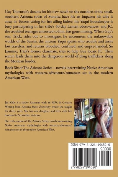 Guy Thornton's dreams for his new ranch on the outskirts of the small, southern Arizona town of Sonoita have hit an impasse: his wife is away in Tucson caring for her ailing father; his Yaqui housekeeper is busy participating in her tribe's 40-day Lenten observances; and JC, the troubled teenager entrusted to him, has gone missing. When Guy's son, Trick, rides out to investigate, he encounters the unknowable worlds of the Surem, the ancient Yaqui spirits who trouble and assist lost travelers, and returns bloodied, confused, and empty-handed. So Jasmine, Trick's former classmate, tries to help Guy locate JC. Their search leads them into the dangerous world of drug traffickers along the Mexican border. Book Six of The Arizona Series-novels intertwining Native American mythologies with western/adventure/romances set in the modern American West.