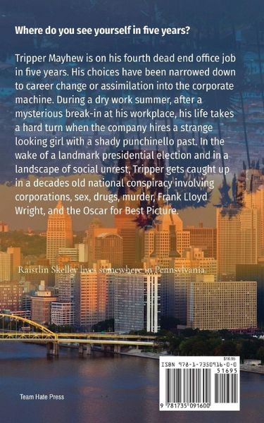 Where do you see yourself in five years? Tripper Mayhew is on his fourth dead end office job in five years. His choices have been narrowed down to career change or assimilation into the corporate machine. During a dry work summer, after a mysterious break-in at his workplace, his life takes a hard turn when the company hires a strange looking girl with a shady punchinello past. In the wake of a landmark presidential election and in a landscape of social unrest, Tripper gets caught up in a decades old national conspiracy involving corporations, sex, drugs, murder, Frank Lloyd Wright, and the Oscar for Best Picture.