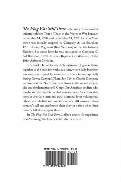 The Flag Was Still There is the story of one combat infantry soldier’s Tour of Duty in the Vietnam War between September 14, 1970, and September 13, 1971. LeBron Matthews was initially assigned to Company A, 1st Battalion, 12th Infantry Regiment (Red Warriors) of the 4th Infantry Division. Six weeks later, he was reassigned to Company C, 3rd Battalion, 187th Infantry Regiment (Rakkasans) of the 101st Airborne Division. This book chronicles the daily existence of grunts living together in the bush for weeks at a time, where daily boredom was only interrupted by moments of sheer terror, especially during Dewey Canyon II/Lam Son 719, as Charlie Company encountered the North Vietnam Army in the mountain jungles and elephant grass of I Corps. The American soldiers who fought and died in this combat were ordinary American kids, most in their late teens and early twenties. Some volunteered: others were drafted into military service. All answered their country’s call and performed their duty in a time when their country failed to support them. In The Flag Was Still There, LeBron covers his experience from "winning" the lottery to life after Vietnam.