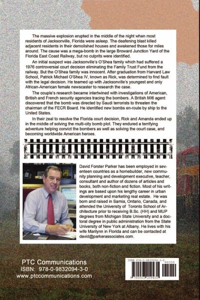 The massive explosion erupted in the middle of the night when most residents of Jacksonville, Florida were asleep. The deafening blast killed adjacent residents in their demolished houses and awakened those for miles around. The cause was a mega-bomb in the large Broward Junction Yard of the Florida East Coast Railway, but no culprits were identified. An initial suspect was Jacksonville's O'Shea family which had suffered a 1976 controversial court decision eliminating the Family Trust Fund from the railway. But the O'Shea family was innocent. After graduation from Harvard Law School, Rick O'Shea, was determined to find fault with the legal decision. He teamed up with Jacksonville's youngest and only African-American female newscaster to research the case. The couple's research became intertwined with investigations of American, British and French security agencies tracing the bombers. A British MI6 agent discovered that the bomb was directed by Saudi terrorists to threaten the chairman of the FECR Board.