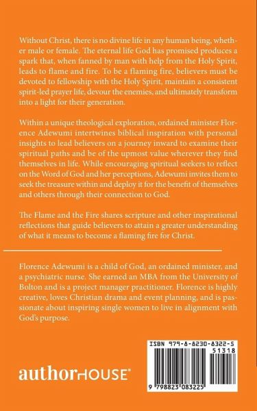 Without Christ, there is no divine life in any human being, whether male or female. The eternal life God has promised produces a spark that, when fanned by man with help from the Holy Spirit, leads to flame and fire. To be a flaming fire, believers must be devoted to fellowship with the Holy Spirit, maintain a consistent spirit-led prayer life, devour the enemies, and ultimately transform into a light for their generation. Within a unique theological exploration, ordained minister Florence Adewumi intertwines biblical inspiration with personal insights to lead believers on a journey inward to examine their spiritual paths and be of the upmost value wherever they find themselves in life. While encouraging spiritual seekers to reflect on the Word of God and her perceptions, Adewumi invites them to seek the treasure within and deploy it for the benefit of themselves and others through their connection to God. The Flame and the Fire shares scripture and other inspirational reflections that guide believers to attain a greater understanding of what it means to become a flaming fire for Christ.