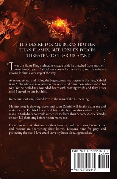His desire for me burns hotter than flames, but unseen forces threaten to tear us apart. I was the Flame King's reluctant mate, a bride he snatched from another man's funeral pyre. Zabriel was chosen for me by fate, and I fought my craving for him every step of the way. At seven feet tall and riding the biggest, meanest dragon in the flare, Zabriel is an Alpha who can take whatever he wants and burn those who stand in his way. Yet he healed my wounded heart with coaxing words and fiery kisses until I craved no one but him. In the midst of war, I found love in the arms of the Flame King. My first heat is drawing closer and soon Zabriel will finally claim me and make me his. I'm his Omega and his bride, but I'm also a witch. There are many in Maledin who would rather see me burn than become Zabriel's bride, or even kill their king before he can marry me. Friends wear masks that conceal their blood-soaked intentions. Enemies past and present are sharpening their knives. Dragons hunt for prey, and protecting the man I love could leave my heart bleeding on ashes.