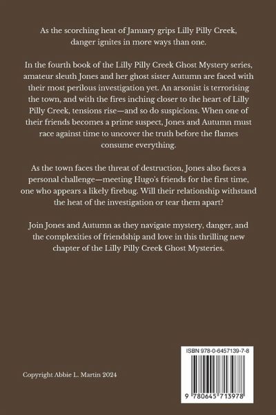 As the scorching heat of January grips Lilly Pilly Creek, danger ignites in more ways than one. In the fourth book of the Lilly Pilly Creek Ghost Mystery series, amateur sleuth Jones and her ghost sister Autumn are faced with their most perilous investigation yet. An arsonist is terrorising the town, and with the fires inching closer to the heart of Lilly Pilly Creek, tensions rise-and so do suspicions. When one of their friends becomes a prime suspect, Jones and Autumn must race against time to uncover the truth before the flames consume everything. As the town faces the threat of destruction, Jones also faces a personal challenge-meeting Hugo's friends for the first time, one who appears a likely firebug. Will their relationship withstand the heat of the investigation or tear them apart? Join Jones and Autumn as they navigate mystery, danger, and the complexities of friendship and love in this thrilling new chapter of the Lilly Pilly Creek Ghost Mysteries.