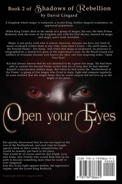 A kingdom where magic is outlawed, a tyrant King, hidden magical academies, an oppressed population. When King Cedric died at the hands of a group of mages, his son, the then Prince Roderick took the reins of the kingdom and with his first decree, banned all magic and magic users from Avondale. Magic is not picky with who it selects, however. Anyone can have any kind of mana awaken within them at any time, from Gaia's Grace - the earth mana, to the Eternal Flame - fire mana. And when that mana is awakened, its presence is telegraphed by a distinctive glow in the individual's eyes. So the Royal Guard and soldiers of Avondale became well known for their one fear inspiring order: 'Open Your Eyes'. Book 2: Kai had always known that he was destined to be a great fire mage. He had been able to control the Eternal Flame within him for so long that he had labelled himself a Journeyman ranked mage. But when he had found the 'Brotherhood of the Flame', a group of fire mages who lived to train, fight and compete regularly, he soon realised that the single flame that he could conjure did not live up to the might of his peers. Kai quickly discovered that he was not equal to the rest of the Brotherhood, and each time he fought against them in their weekly competitions, he would be soundly put back in his place. That would be of course until he met Elijah, Lyra and Alina, who would help him on his path to become something more than he could've ever imagined. A Young Adult Fantasy set in the fictional kingdom of Avondale.