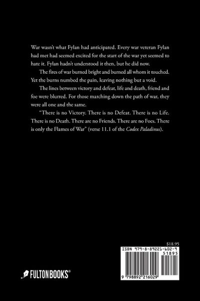 War wasn't what Fylan had anticipated. Every war veteran Fylan had met had seemed excited for the start of the war yet seemed to hate it. Fylan hadn't understood it then, but he did now. The fires of war burned bright and burned all whom it touched. Yet the burns numbed the pain, leaving nothing but a void. The lines between victory and defeat, life and death, friend and foe were blurred. For those marching down the path of war, they were all one and the same. "There is no Victory. There is no Defeat. There is no Life. There is no Death. There are no Friends. There are no Foes. There is only the Flames of War" (verse 11.1 of the Codex Paladinus).