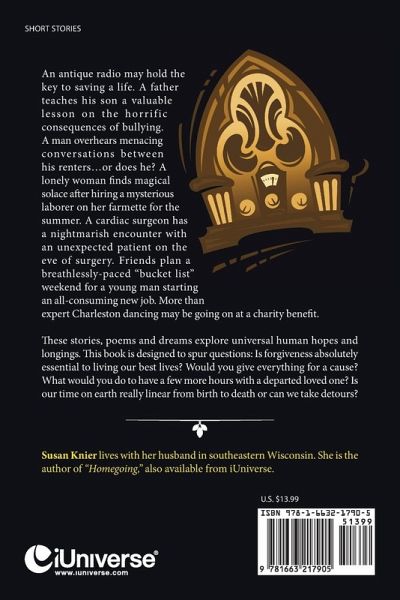 An antique radio may hold the key to saving a life. A father teaches his son a valuable lesson on the horrific consequences of bullying. A man overhears menacing conversations between his renters...or does he? A lonely woman finds magical solace after hiring a mysterious laborer on her farmette for the summer. A cardiac surgeon has a nightmarish encounter with an unexpected patient on the eve of surgery. Friends plan a breathlessly-paced "bucket list" weekend for a young man starting an all-consuming new job. More than expert Charleston dancing may be going on at a charity benefit. These stories, poems and dreams explore universal human hopes and longings. This book is designed to spur questions: Is forgiveness absolutely essential to living our best lives? Would you give everything for a cause? What would you do to have a few more hours with a departed loved one? Is our time on earth really linear from birth to death or can we take detours?