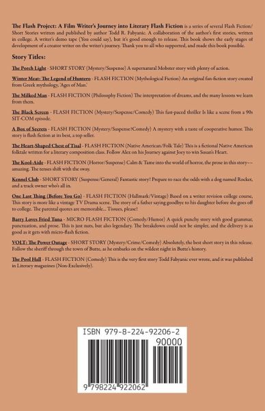 The Flash Project: A Film Writer's Journey into Literary Flash Fiction is a series of several Flash Fiction/Short Stories written and published by author Todd Fabyanic-a collaboration of Todd's first published writings in college. Todd went to college to become a Film Writer but learned all aspects of writing while Studying, including Literary Flash Fiction based on story structure techniques. Story Titles: The Porch Light - SHORT STORY (Mystery/Suspense) Winter Meat: The Legend of Huntero - FLASH FICTION (Mythological Fiction) The Milked Man - FLASH FICTION (Philosophy Fiction) The Black Screen - FLASH FICTION (Mystery/Suspense/Comedy) A Box of Secrets - FLASH FICTION (Mystery/Suspense?Comedy) The Heart-Shaped Chest of Tisal - FLASH FICTION (Native American/Folk Tale) The Kool-Aide - FLASH FICTION (Horror/Suspense) Kennel Club - SHORT STORY (Suspense/General) Fantastic story! One Last Thing (Before You Go) - FLASH FICTION (Hallmark/Vintage) Tissues, please! Barry Loves Fried Tuna - MICRO FLASH FICTION (Comedy/Humor) VOLT: The Power Outage - SHORT STORY (Mystery/Crime/Comedy) Absolutely, the best short story in this release. The Pool Hall - FLASH FICTION (Comedy) This is the very first story Todd Fabyanic ever wrote, and it was published in Literary magazines (Non-Exclusively).