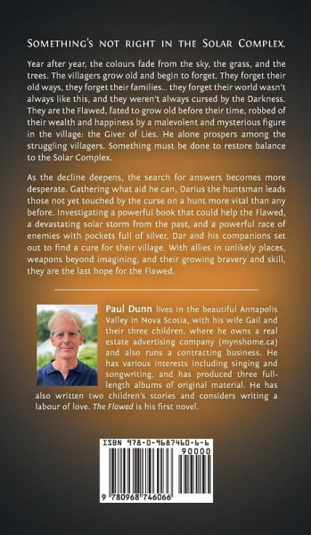 Something's not right in the Solar Complex. Year after year, the colours fade from the sky, the grass, and the trees. The villagers grow old and begin to forget. They forget their old ways, they forget their families... they forget their world wasn't always like this, and they weren't always cursed by the Darkness. They are the Flawed, fated to grow old before their time, robbed of their wealth and happiness by a malevolent and mysterious figure in the village: the Giver of Lies. He alone prospers among the struggling villagers. Something must be done to restore balance to the Solar Complex. As the decline deepens, the search for answers becomes more desperate. Gathering what aid he can, Darius the huntsman leads those not yet touched by the curse on a hunt more vital than any before. Investigating a powerful book that could help the Flawed, a devastating solar storm from the past, and a powerful race of enemies with pockets full of silver, Dar and his companions set out to find a cure for their village. With allies in unlikely places, weapons beyond imagining, and their growing bravery and skill, they are the last hope for the Flawed.
