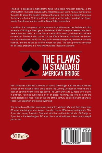 This book is designed to highlight the flaws in Standard American bidding, i.e. the SAYC system. The book discusses the major failures of SAYC, namely the failure of the ACBL to adopt the Bergen point-count system, the failure to simplify reverses, the failure to find a 20-21p bid for all hands, and the failure to adopt the Casey-Jacoby Transfer convention and the Casey Rebid convention. In addition, the book points out numerous minor failures such as the failure to find a means of bidding a direct game, the failure of SAYC to require takeout doubles to have a four-card major, and the failure to adopt Minorwood, a six-keycard kickback convention. The book also points out the ACBL's failure to clarify certain issues, such as the failure to clarify O's reply to R's two-level response, the failure to clarify cuebids, and the failure to clarify Stopper-Ask bids. The book provides a solution for all these problems in a new system called Precision Diamond.