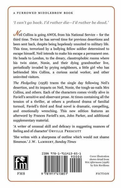 'I can't go back. I'd rather die-I'd rather be dead.' Neil Collins is going AWOL from his National Service - for the third time. Twice he has served time for previous desertions and been sent back, despite being hopelessly unsuited to military life. This time, terrorized by a bullying fellow soldier determined to escape himself, Neil intends to make his escape a permanent one. He heads to London, to the dreary, claustrophobic rooms where his twin sister, Nonie, and their dying grandmother live, periodically invaded by prying neighbours, a little girl who has befriended Mrs Collins, a curious social worker, and other uninvited visitors. The Fledgeling (1958) traces the single day following Neil's desertion, and its impacts on Neil, Nonie, the tough-as-nails Mrs Collins, and others. Each of the characters comes vividly alive in Faviell's sensitive and observant prose. At times containing all the tension of a thriller, at others a profound drama of familial turmoil, Faviell's third and final novel is dramatic, compelling, and emotionally wrenching. This new edition features an afterword by Frances Faviell's son, John Parker, and additional supplementary material. 'A writer of unusual skill and delicacy in suggesting nuances of feeling and of character' Orville Prescott 'She writes with a sharpness of outline which would not shame Simenon.' J.W. Lambert, Sunday Times