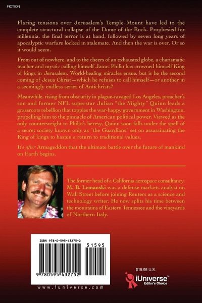 Flaring tensions over Jerusalem's Temple Mount have led to the complete structural collapse of the Dome of the Rock. Prophesied for millennia, the final terror is at hand, followed by seven long years of apocalyptic warfare locked in stalemate. And then the war is over. Or so it would seem. From out of nowhere, and to the cheers of an exhausted globe, a charismatic teacher and mystic calling himself Janus Philio has crowned himself King of kings in Jerusalem. World-healing miracles ensue, but is he the second coming of Jesus Christ-which he refuses to call himself-or another in a seemingly endless series of Antichrists? Meanwhile, rising from obscurity in plague-ravaged Los Angeles, preacher's son and former NFL superstar Julian "the Mighty" Quinn leads a grassroots rebellion that topples the war-happy government in Washington, propelling him to the pinnacle of American political power. Viewed as the only counterweight to Philio's heresy, Quinn soon falls under the spell of a secret society known only as "the Guardians" set on assassinating the King of kings to hasten a return to traditional values. It's after Armageddon that the ultimate battle over the future of mankind on Earth begins.