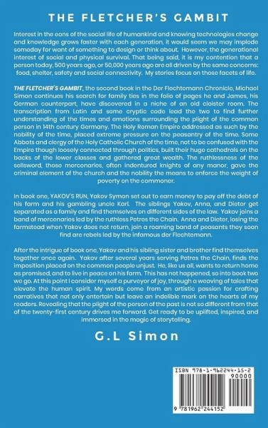 Interest in the eons of the social life of humankind and knowing technologies change and knowledge grows faster with each generation, it would seem we may implode someday for want of something to design or think about. However, the generational interest of social and physical survival. That being said, it is my contention that a person today, 500 years ago, or 50,000 years ago are all driven by the same concerns: food, shelter, safety and social connectivity. My stories focus on those facets of life. THE FLETCHER'S GAMBIT, the second book in the Der Flechtemann Chronicle, Michael Simon continues his search for family ties in the folio of pages he and James, his German counterpart, have discovered in a niche of an old cloister room. The transcription from Latin and some cryptic code lead the two to find further understanding of the times and emotions surrounding the plight of the common person in 14th century Germany. The Holy Roman Empire addressed as such by the nobility of the time, placed extreme pressure on the peasantry of the time. Some Abbots and clergy of the Holy Catholic Church of the time, not to be confused with the Empire though loosely connected through politics, built their huge cathedrals on the backs of the lower classes and gathered great wealth. The ruthlessness of the sellsword, those mercenaries, often indentured knights of any manor, gave the criminal element of the church and the nobility the means to enforce the weight of poverty on the commoner. In book one, YAKOV'S RUN, Yakov Symon set out to earn money to pay off the debt of his farm and his gambling uncle Karl. The siblings Yakov, Anna, and Dieter get separated as a family and find themselves on different sides of the law. Yakov joins a band of mercenaries led by the ruthless Petres the Chain. Anna and Dieter, losing the farmstead when Yakov does not return, join a roaming band of peasants they soon find are rebels led by the infamous der Flechtemann. After the intrigue of book one, Yakov and his sibling sister and brother find themselves together once again. Yakov after several years serving Petres the Chain, finds the imposition placed on the common people unjust. He, like us all, wants to return home as promised, and to live in peace on his farm. This has not happened, so into book two we go. At this point I consider myself a purveyor of joy, through a weaving of tales that elevate the human spirit. My words come from an artistic passion for crafting narratives that not only entertain but leave an indelible mark on the hearts of my readers. Revealing that the plight of the person of the past is not so different from that of the twenty-first century drives me forward. Get ready to be uplifted, inspired, and immersed in the magic of storytelling.