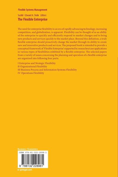 Part I Enterprise and Strategic Flexibility.- Chapter 1: The Concept of Flexible Enterprise.- Chapter 2: Creating Enterprise Flexibility through Service Oriented Architecture.- Chapter 3: Defining Strategic Flexibility.- Chapter 4: Flexible Strategy Framework for Managing Continuity and Change in E-government.- Chapter 5: Government Regulator's Role in Managing Competition through Flexibility in Telecom Industry of India: A Policy Perspective.- Chapter 6: Theoretical Roots of Flexible Strategy Game-card: An Evolving Strategic Performance Management Framework.- Part II: Organizational Flexibility.- Chapter 7: Architecting Flexible Organizations.- Chapter 8: Towards Understanding the Effects of Outsourcing on the Flexibility Dynamic of System of Systems.- Chapter 9: Creating Order out of Disorder through Intuitive Flexibility.- Chapter 10: Framework for Utilization of Global Resources for Knowledge Creation and Application through Flexible Organizations.- Chapter 11: Flexibility, Controllability and Risk Measurement Metrics in Changing Pattern of Business Environment.- Part III: Business Process and Information Systems Flexibility.- Chapter 12: On How Agile Systems Gracefully Migrate Across Next-Generation Life Cycle Boundaries.- Chapter 13: In Pursuit of Workflow Breakthroughs Using Just Enough Process Management.- Chapter 14: Developing Flexible Business Process Management Systems Using Modular Computing Technologies.- Chapter 15: Rapid Deployment Approach through Flexible System Design: Breakthrough in Technology Innovation and Process Optimization for eClinical Trials.- Chapter 16: Information Systems Flexibility in Organizations: Conceptual Models and Research Issues.- Part IV: Operations Flexibility.- Chapter 17: Flexibility via Virtual Cellular System for Variability.- Chapter 18: Role of Manpower Flexibility in Lean Manufacturing.- Chapter 19: Supply Chain Flexibility: Some Perceptions.- Chapter 20: Marketing Flexibilities: Lessons from theCorporate.