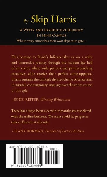 The Flight Line Commedia is a humorous and poetic description of modern air travel based on Dante Alighieri's 14th century masterpiece, La Divina Commedia. The journey begins with the author lost in a dark, forbidding wilderness, in this case McCarran International Airport in Las Vegas (LAS). Thus begins the author's not so metaphorical "Infernal Return" home. With the help of his guide, Virgil, he journeys beneath the airport, meeting souls condemned to poetic justice for their sins as obnoxious airline travellers. Each level down takes him to more serious sinners until the worst sinners of all, The Managers. Finally, leaving purgatory behind, he emerges to the light of a new dawn, where his angel, the flight attendant Beatrice, guides him to his plane. The Flight Line Commedia remains true to Dante's unique rhyme scheme, with references to The Inferno as well as Star Wars and The Simpsons. It was the first-place winner in the 2011 Wergle Flomp Humor Poetry Contest.