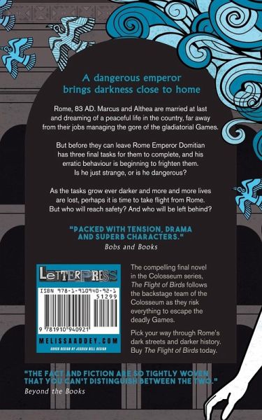 A dangerous emperor brings darkness close to home Rome, 83 AD. Marcus and Althea are married at last and dreaming of a peaceful life in the country, far away from their jobs managing the gore of the gladiatorial Games. But before they can leave Rome Emperor Domitian has three final tasks for them to complete, and his erratic behaviour is beginning to frighten them. Is he just strange, or is he dangerous? As the tasks grow ever darker and more and more lives are lost, perhaps it is time to take flight from Rome. But who will reach safety? And who will be left behind? The compelling final novel in the Colosseum series, The Flight of Birds follows the backstage team of the Colosseum as they risk everything to escape the deadly Games. Pick your way through Rome's dark streets and darker history. Buy The Flight of Birds today.