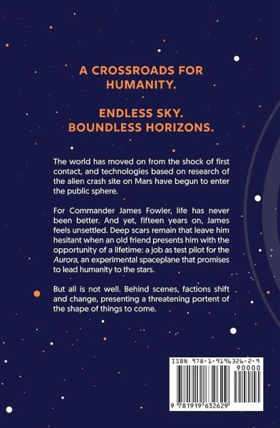 A CROSSROADS FOR HUMANITY. ENDLESS SKY. BOUNDLESS HORIZONS. The world has moved on from the shock of first contact, and technologies based on research of the alien crash site on Mars have begun to enter the public sphere. For Commander James Fowler, life has never been better. And yet, fifteen years on, James feels unsettled. Deep scars remain that leave him hesitant when an old friend presents him with the opportunity of a lifetime: a job as test pilot for the Aurora, an experimental spaceplane that promises to lead humanity to the stars. But all is not well. Behind scenes, factions shift and change, presenting a threatening portent of the shape of things to come.