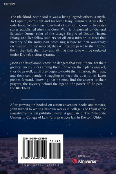 The Blackbird. Some said it was a living legend; others, a myth. To Captain Jason Kent and his love Deany Summers, it was their only hope. When their homeland of California, one of five city-states established after the Great War, is threatened by General Salvador Drone, ruler of the savage Empire of Dodum, Jason, Deany, and five fellow soldiers set off on a mission to meet that memory of the misty past promising release to their war-weary civilization. If they succeed, they will restore peace to their home. But if they fail, then they and all that they love will be enslaved under Drone's vicious tyranny. Jason and his platoon know the dangers that await them. Yet their greatest enemy lurks among them; for when their plans unravel, they do as well, until they begin to doubt their mission, their way, and their commander. Struggling to keep the quest alive, Jason pushes forward, knowing that he must find the answer to their prayers, the mystery behind the legend, the power of the past-the Blackbird.