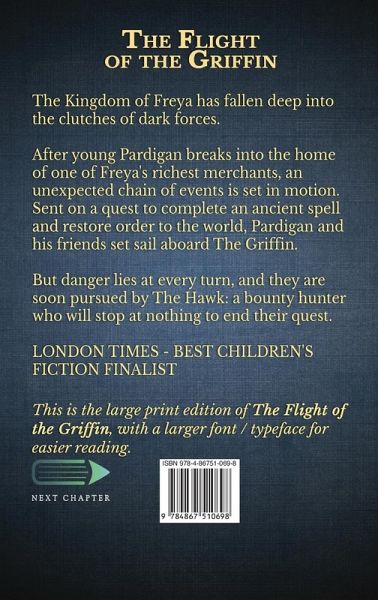 The Kingdom of Freya has fallen deep into the clutches of dark forces. After young Pardigan breaks into the home of one of Freya's richest merchants, an unexpected chain of events is set in motion. Sent on a quest to complete an ancient spell and restore order to the world, Pardigan and his friends set sail aboard The Griffin. But danger lies at every turn, and they are soon pursued by The Hawk: a bounty hunter who will stop at nothing to end their quest. LONDON TIMES - BEST CHILDREN'S FICTION FINALIST This is the large print edition of The Flight of the Griffin, with a larger font / typeface for easier reading.